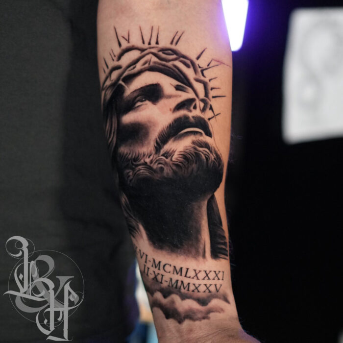 Black and Grey Realism Jesus Portrait Tattoo